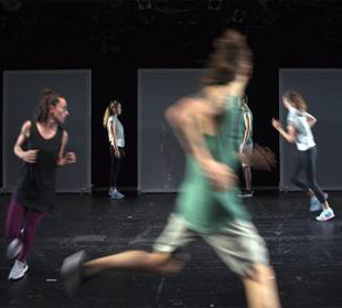 RUNNING ist eine Collage aus Text, Bewegung, Sound, Video und Raum, die das Rennen um den Platz im Leben mit einem Marathon vergleicht.
