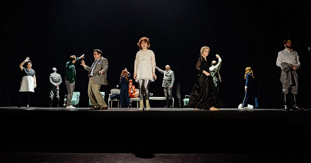 Am 29.02.2020 feierte DREI SCHWESTERN von Anton Tschechow in einer Neuübersetzung von Alexander Nitzberg am Staatstheater Mainz Premiere. Regie führte Maren E. Bjørseth. Passend zum Aufbruch der drei Schwestern, der nicht so recht gelingen will, verwandelt sich die Bühne in einen ewigen Wartesaal. Die Sorgen, Liebesnöte und vergeblichen Ausbruchsversuche führen jedoch nicht in lethargische Verzweiflung, sondern zu bissigen und grotesken Dialogen.